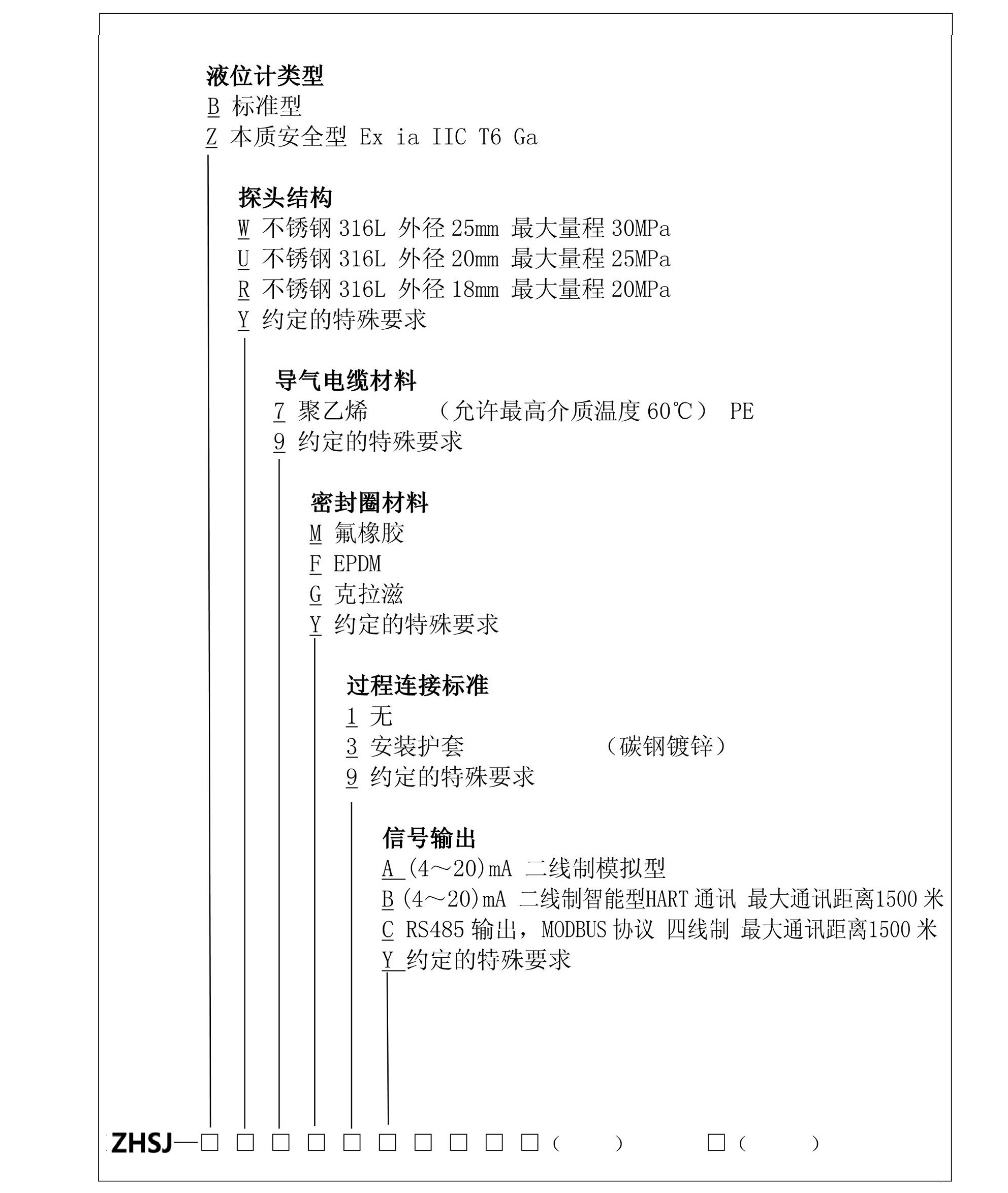 与介质接 触部分材质 | 硅压阻式传感器 ·波纹膜片316L(约定的特殊要求) 测量传感器壳体 ·不锈钢316L 投入延长电缆 ·塑料PE/F46 传感器配重 ·不锈钢304(约定的特殊要求) |