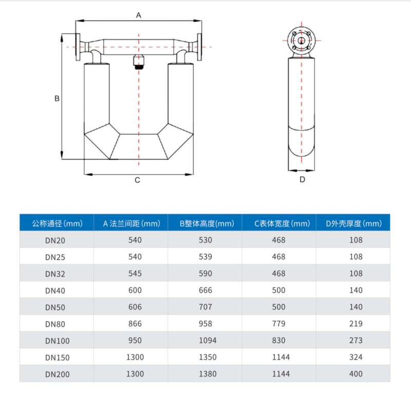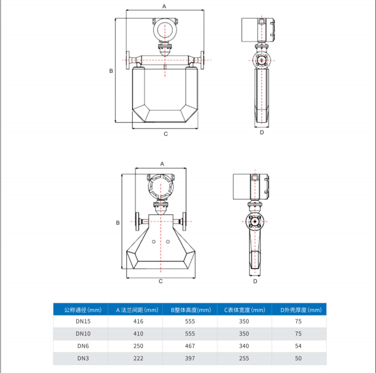 标准一体式(DN20~DN200)质量流量计外形示意图和安装尺寸表