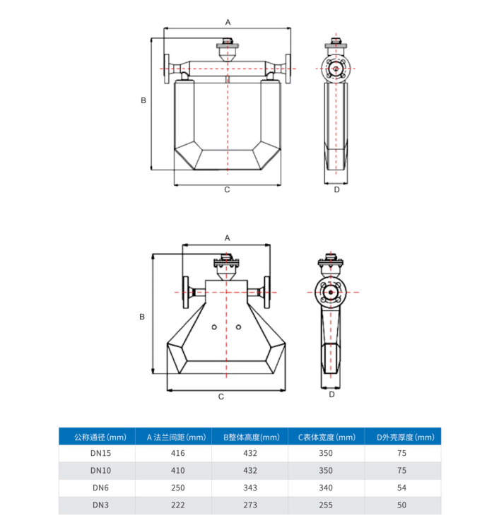 分体式(DN20~DN200)质量流量计外形示意图和安装尺寸表