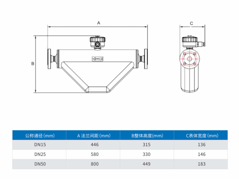 ***(DN15及以下)质量流量计外形示意图及安装尺寸表(一体式)