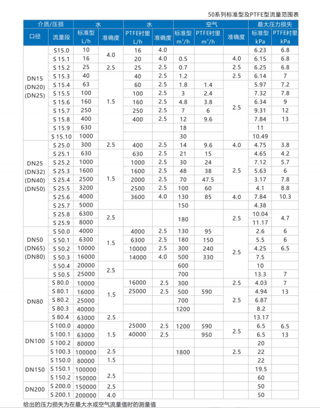 水:10~200000L/h;空气:-0.5~2000m³/h